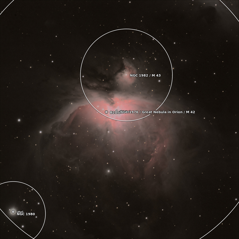 The bottom two images indicate the location of M42 and come from a plate solve at astrometry.net