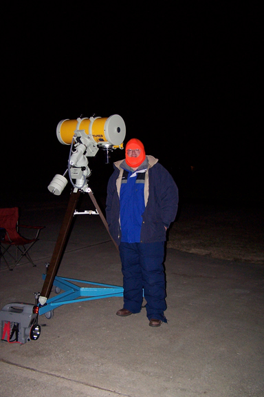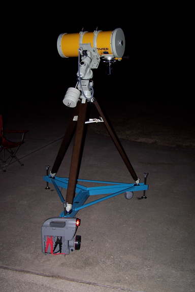 This set of images was collected with my Takahashi Epsilson 210 with a SXV-H9C camera. The iCCD software (Mac OS X on a Powerbook G4) was used to process the series of 15 (60 sec) images. The top image is the sum of the images with a Lucy-Richardson deconvolution. The second image is the sum prior to the deconvolution. These images have been scaled down from the full size of the chip, ~800 by 600 pixels here. Click the image to get the full version. It was a cold night (2/18/2005) but it was the first time that I had been able to image since 9/11/2004. It was the first time that I imaged after attempting to collimating the Epsilon. I think that it might be worse now than it was before the attempt. It was also the first test of my mount roller system pictured above. This worked exceptionally well. The jump test during imaging showed no negative effects. Although, it is hard to jump up and down in cold weather gear. The mount roller will be made commercially available soon, including a kinematical version. |