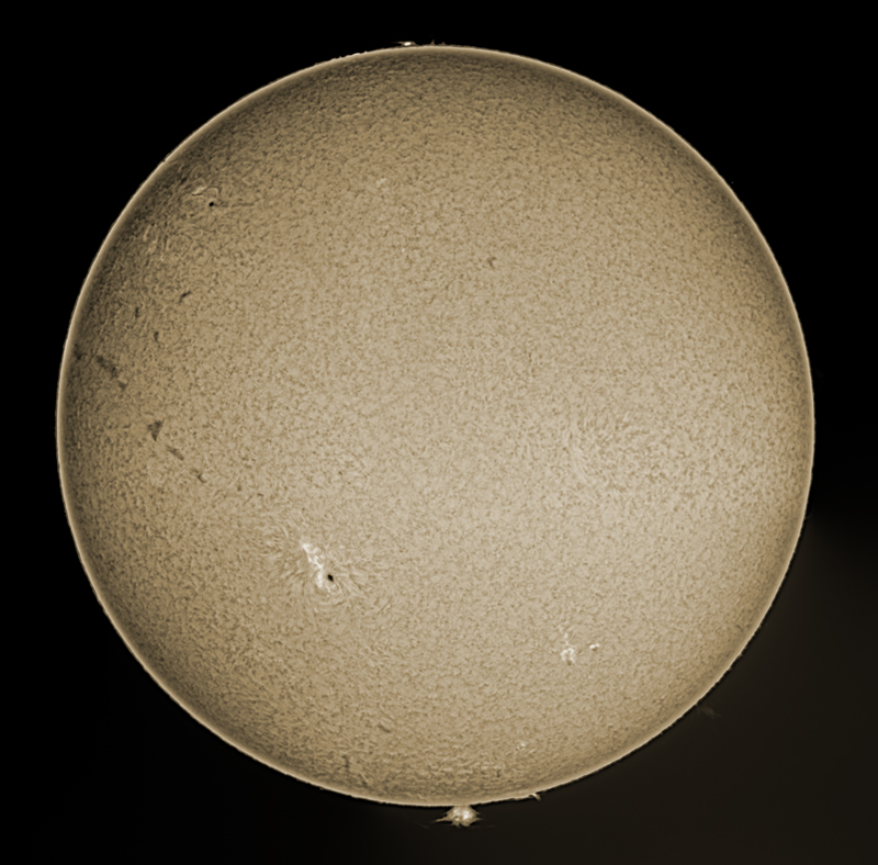 The image is a mosaic of ten averaged frames of 4 millisecond exposures with a Coronado 90mm Solarmax II filter mounted on an Astro-Physics 130 Starfire GT