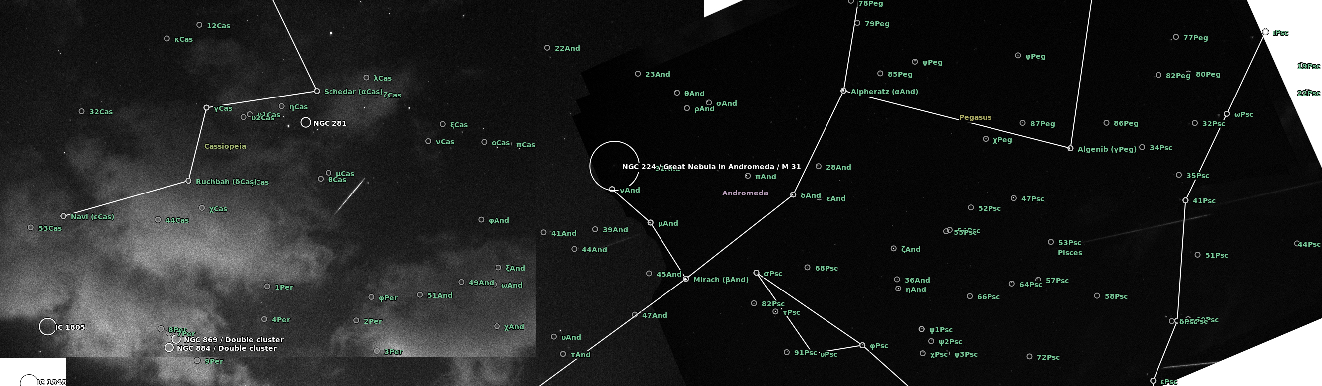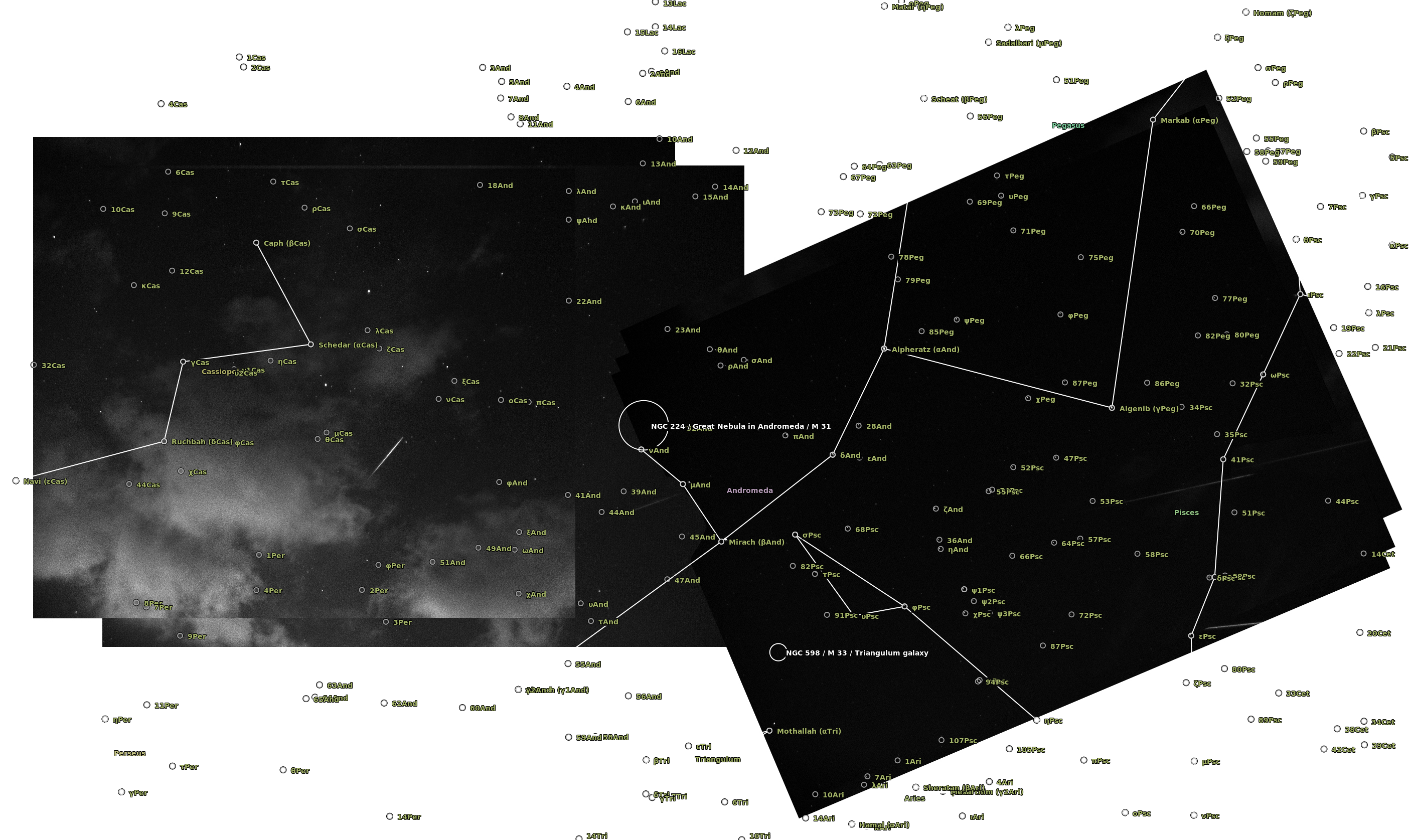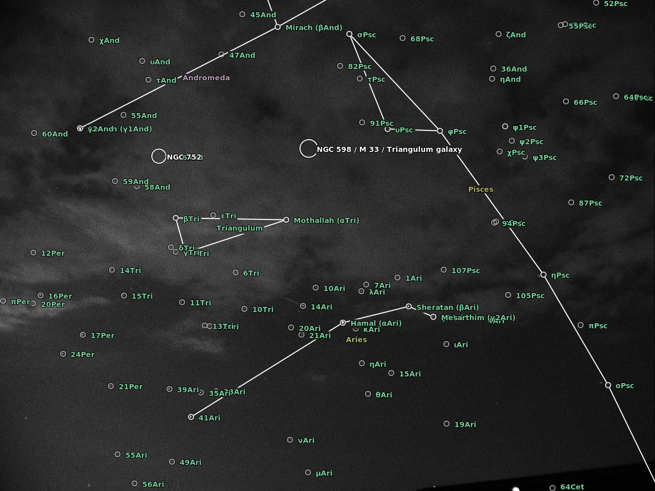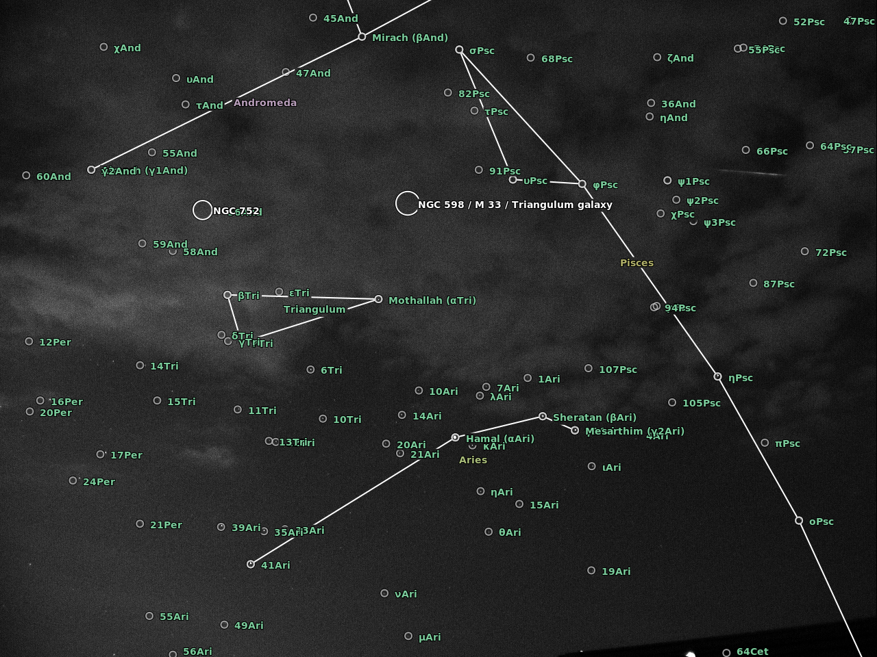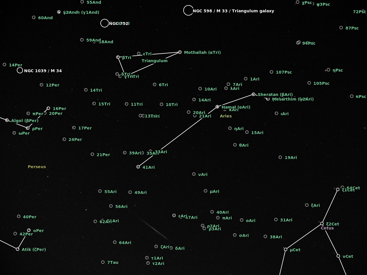 The camera was an Imaging Source DMK41BF02 controlled with AstroIIDC. A cheap CS lens was attached to the camera with the entire device supported on a camera tripod. I was shooting wherever I could at the start and then focused on Aries which was in the path of a number of meteors. The plate solving at astrometry.net is a bit off but does give an idea of the radiant in Perseus..